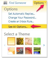 2. Located in the upper right-hand corner of OWA you will find the Options drop down menu. Click Options to reveal See All Options.