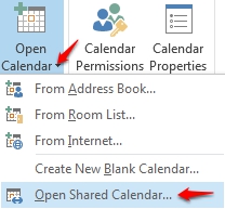 4. Within the Folder tab, click the Open Calendar icon drop down menu and choose Open Shared Calendar.