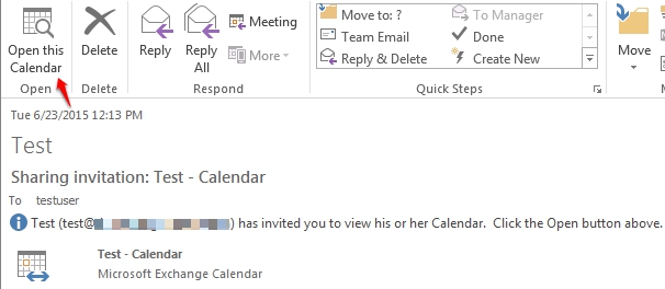 Note: When a member of your organization shares a calendar, typically a Sharing Invitation message is generated and sent to the user. Selecting Open this Calendar will accept the invitation and place the calendar under Share Calendars.