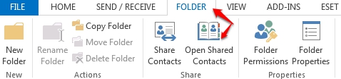 3. Once the ribbon has adjusted to reflect contact options, select the Folder Tab and click the Open Shared Contacts icon.