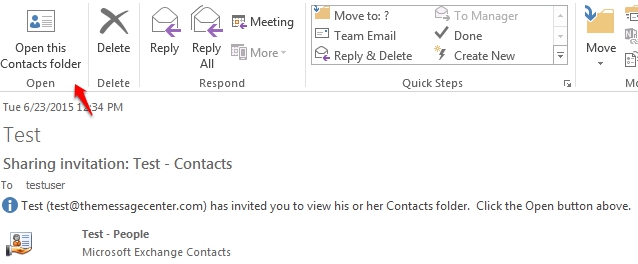 Note: When a member of your organization shares a contacts folder, typically a Sharing Invitation message is generated and sent to the user. Selecting Open this Contacts Folder will accept the invitation and place the folder under Share Contacts.