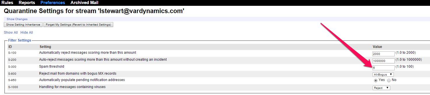 3. Under these settings are several different sections, this article pertains to the SPAM threshold setting. Here you can adjust the level of filtration based on the score of the message.