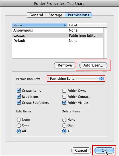 •  C.  On the Permissions tab click on Add User and find the user you want to share a subfolder with.